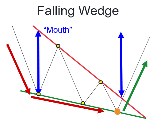 The falling wedge forms in downtrends with lower highs and lows, but selling pressure weakens.